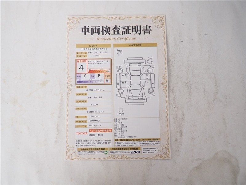 詳細及び現状の車両状態につきましては、店舗スタッフまでお尋ねください。 - 注2)上記と同様の評価点・状態表を「車両検査証明書」として店舗の展示車両に搭載しております。