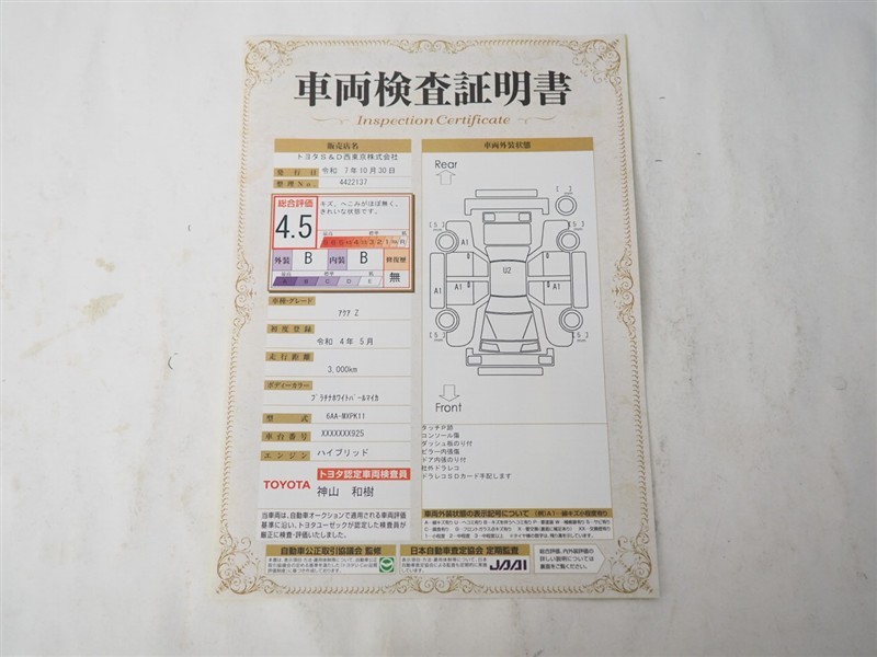 詳細及び現状の車両状態につきましては、店舗スタッフまでお尋ねください。 - 注2)上記と同様の評価点・状態表を「車両検査証明書」として店舗の展示車両に搭載しております。