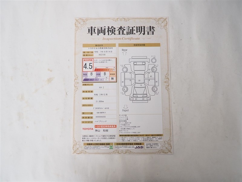 詳細及び現状の車両状態につきましては、店舗スタッフまでお尋ねください。 - 注2)上記と同様の評価点・状態表を「車両検査証明書」として店舗の展示車両に搭載しております。