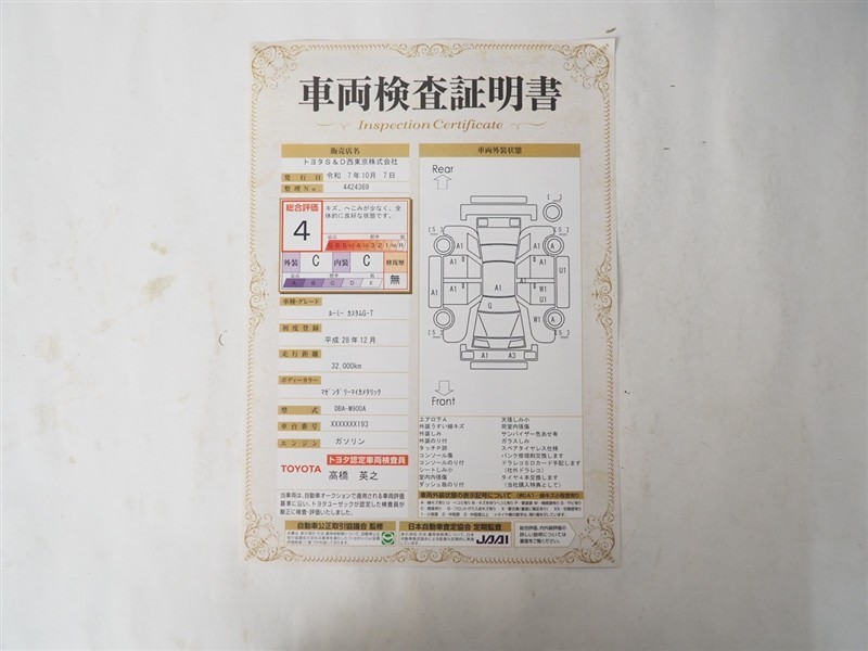 詳細及び現状の車両状態につきましては、店舗スタッフまでお尋ねください。 - 注2)上記と同様の評価点・状態表を「車両検査証明書」として店舗の展示車両に搭載しております。