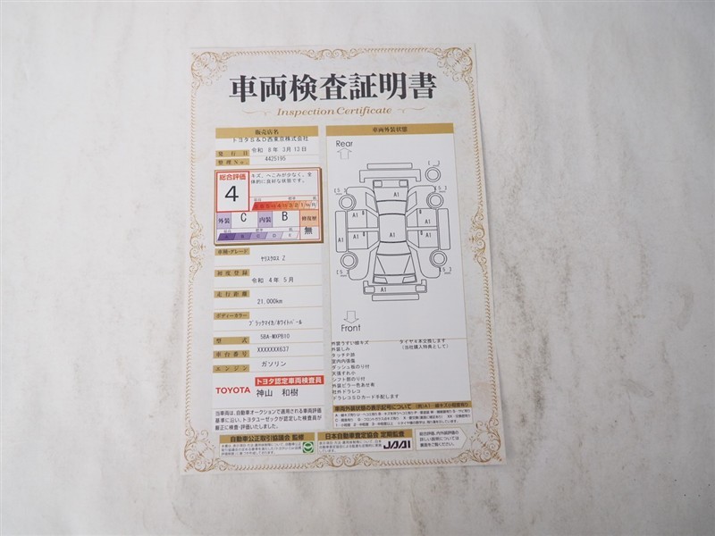 詳細及び現状の車両状態につきましては、店舗スタッフまでお尋ねください。 - 注2)上記と同様の評価点・状態表を「車両検査証明書」として店舗の展示車両に搭載しております。