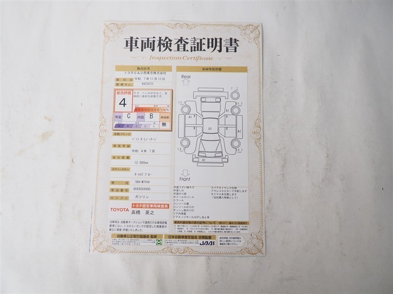 詳細及び現状の車両状態につきましては、店舗スタッフまでお尋ねください。 - 注2)上記と同様の評価点・状態表を「車両検査証明書」として店舗の展示車両に搭載しております。