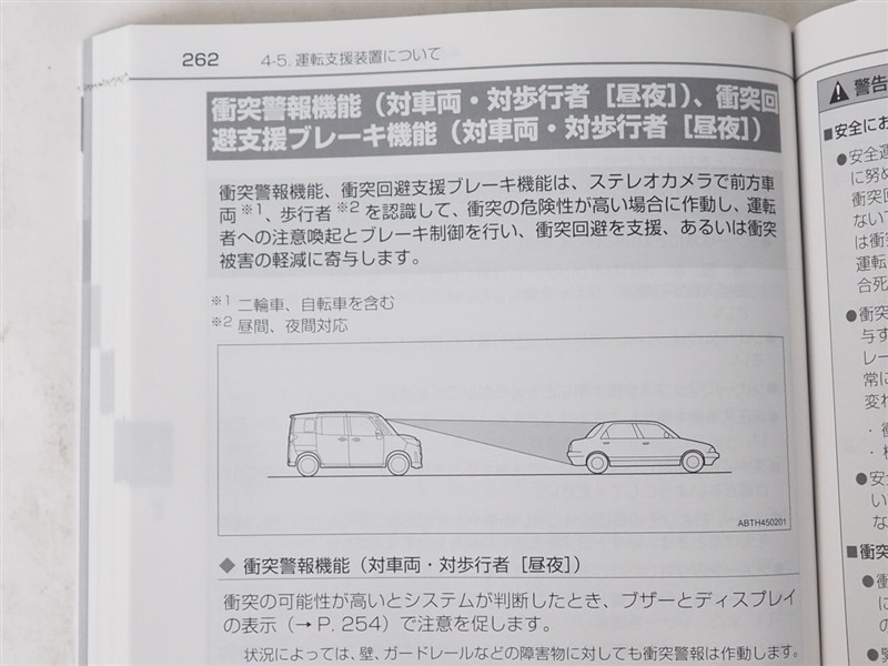 - 予防安全装置の各機能の作動には、速度や対象物等の条件があります。また、道路状況、車両状態、天候等により作動しない場合があります。
