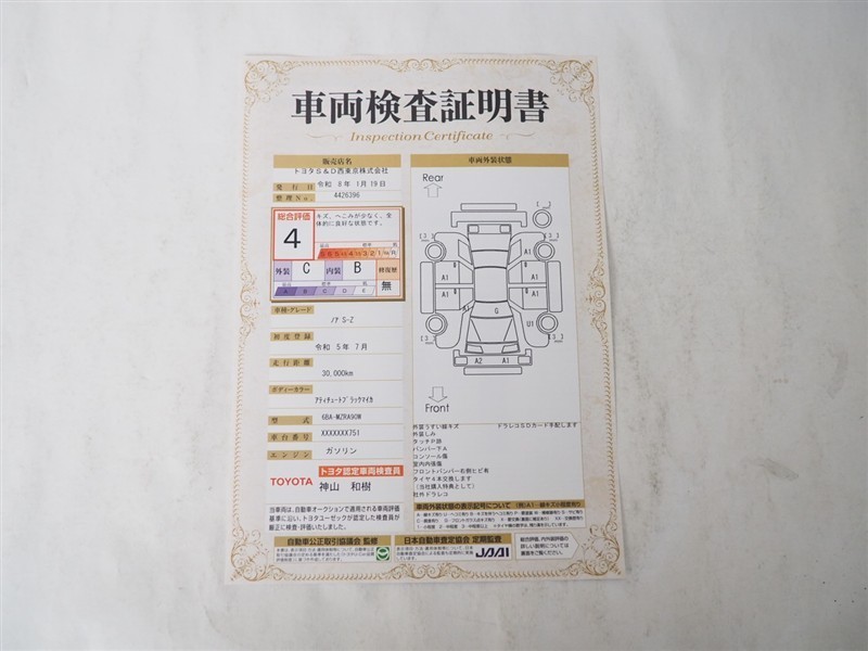 詳細及び現状の車両状態につきましては、店舗スタッフまでお尋ねください。 - 注2)上記と同様の評価点・状態表を「車両検査証明書」として店舗の展示車両に搭載しております。