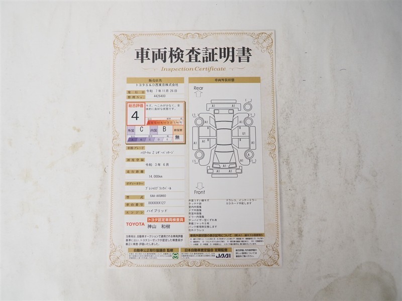 詳細及び現状の車両状態につきましては、店舗スタッフまでお尋ねください。 - 注2)上記と同様の評価点・状態表を「車両検査証明書」として店舗の展示車両に搭載しております。