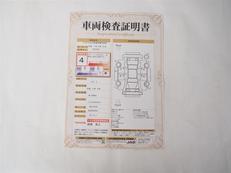 詳細及び現状の車両状態につきましては、店舗スタッフまでお尋ねください。 - 注2)上記と同様の評価点・状態表を「車両検査証明書」として店舗の展示車両に搭載しております。