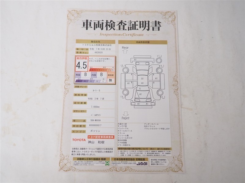 詳細及び現状の車両状態につきましては、店舗スタッフまでお尋ねください。 - 注2)上記と同様の評価点・状態表を「車両検査証明書」として店舗の展示車両に搭載しております。