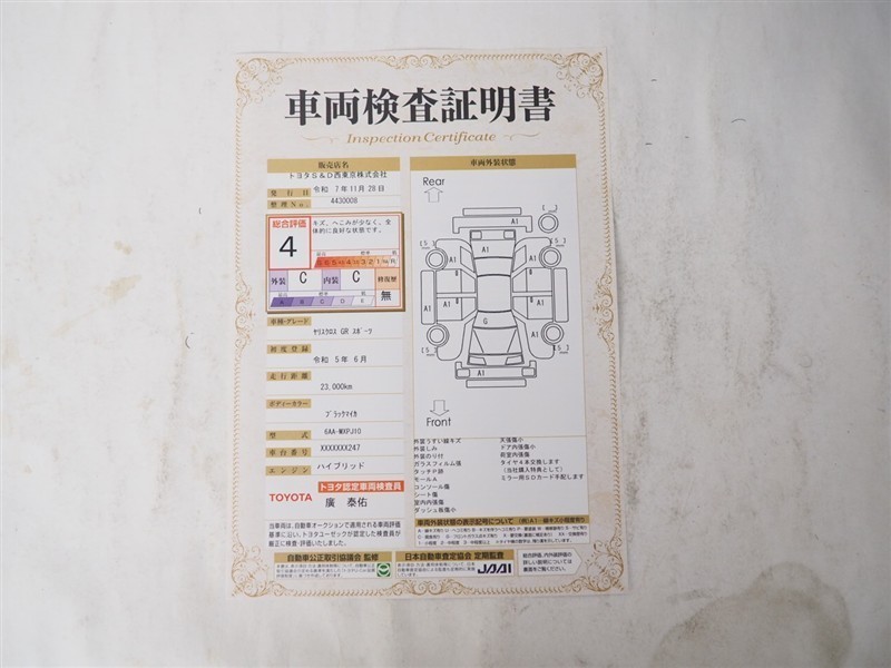 詳細及び現状の車両状態につきましては、店舗スタッフまでお尋ねください。 - 注2)上記と同様の評価点・状態表を「車両検査証明書」として店舗の展示車両に搭載しております。
