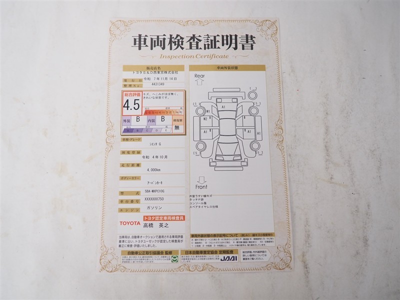 詳細及び現状の車両状態につきましては、店舗スタッフまでお尋ねください。 - 注2)上記と同様の評価点・状態表を「車両検査証明書」として店舗の展示車両に搭載しております。