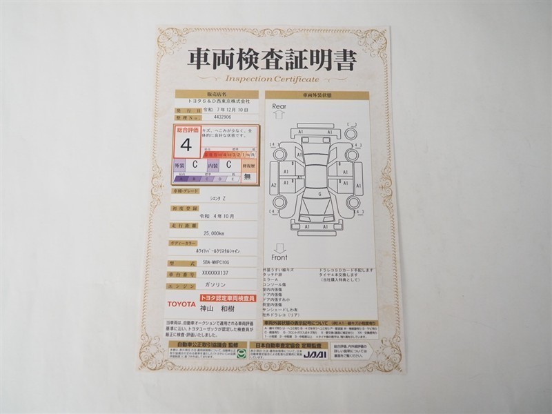 詳細及び現状の車両状態につきましては、店舗スタッフまでお尋ねください。 - 注2)上記と同様の評価点・状態表を「車両検査証明書」として店舗の展示車両に搭載しております。
