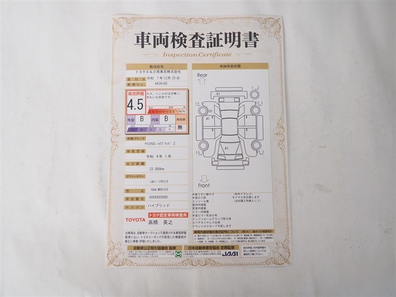 詳細及び現状の車両状態につきましては、店舗スタッフまでお尋ねください。 - 注2)上記と同様の評価点・状態表を「車両検査証明書」として店舗の展示車両に搭載しております。