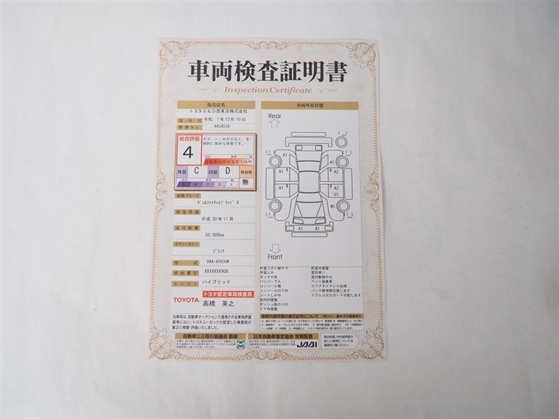 詳細及び現状の車両状態につきましては、店舗スタッフまでお尋ねください。 - 注2)上記と同様の評価点・状態表を「車両検査証明書」として店舗の展示車両に搭載しております。