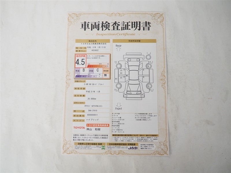 詳細及び現状の車両状態につきましては、店舗スタッフまでお尋ねください。 - 注2)上記と同様の評価点・状態表を「車両検査証明書」として店舗の展示車両に搭載しております。