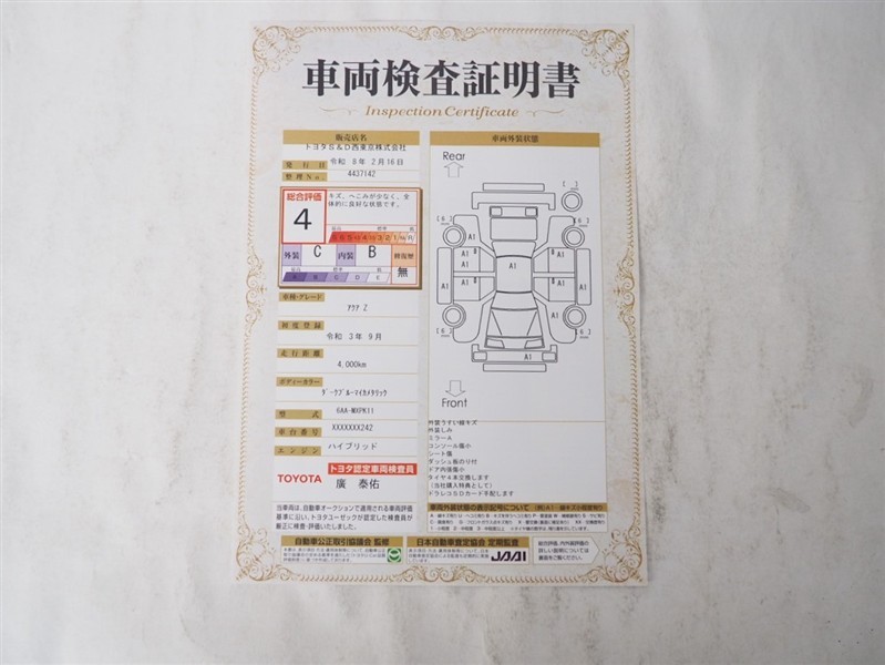 詳細及び現状の車両状態につきましては、店舗スタッフまでお尋ねください。 - 注2)上記と同様の評価点・状態表を「車両検査証明書」として店舗の展示車両に搭載しております。