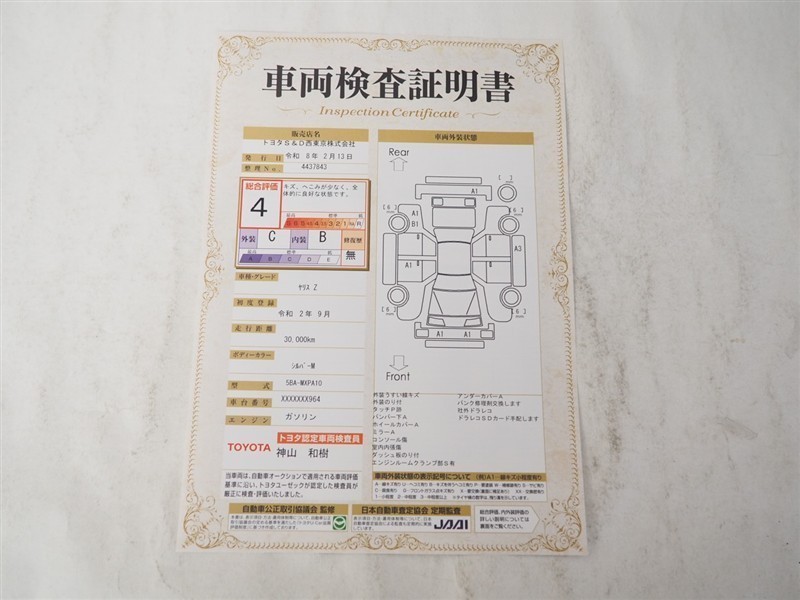 詳細及び現状の車両状態につきましては、店舗スタッフまでお尋ねください。 - 注2)上記と同様の評価点・状態表を「車両検査証明書」として店舗の展示車両に搭載しております。