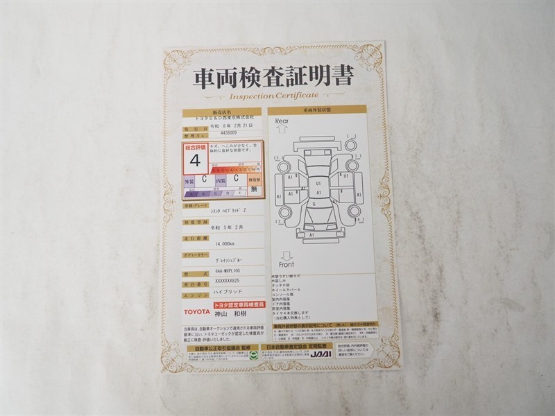 詳細及び現状の車両状態につきましては、店舗スタッフまでお尋ねください。 - 注2)上記と同様の評価点・状態表を「車両検査証明書」として店舗の展示車両に搭載しております。