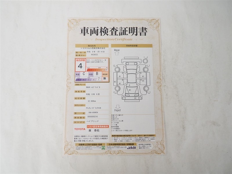 詳細及び現状の車両状態につきましては、店舗スタッフまでお尋ねください。 - 注2)上記と同様の評価点・状態表を「車両検査証明書」として店舗の展示車両に搭載しております。