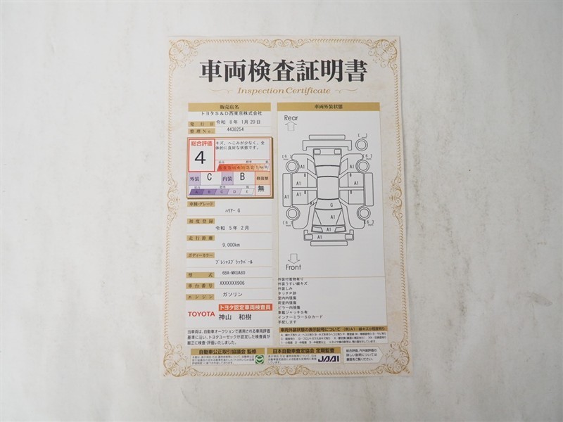 詳細及び現状の車両状態につきましては、店舗スタッフまでお尋ねください。 - 注2)上記と同様の評価点・状態表を「車両検査証明書」として店舗の展示車両に搭載しております。