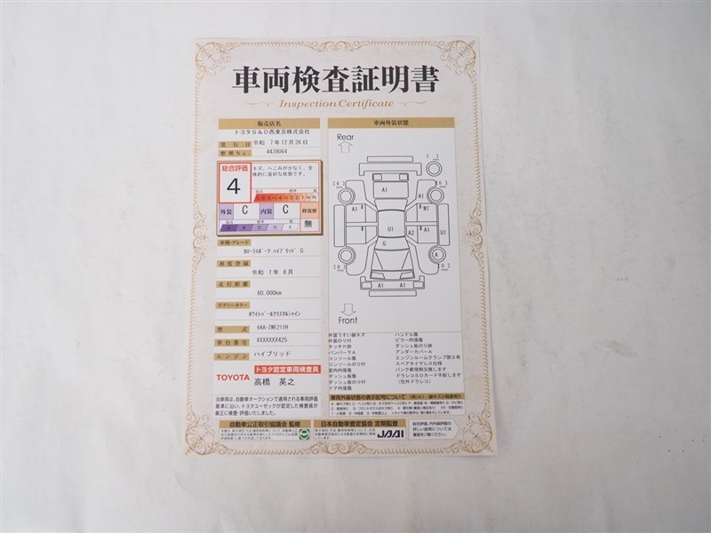 詳細及び現状の車両状態につきましては、店舗スタッフまでお尋ねください。 - 注2)上記と同様の評価点・状態表を「車両検査証明書」として店舗の展示車両に搭載しております。