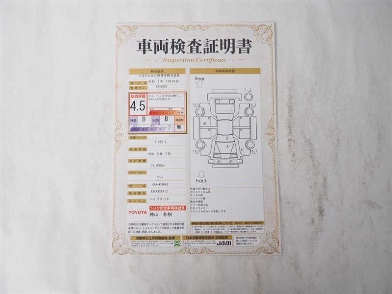 詳細及び現状の車両状態につきましては、店舗スタッフまでお尋ねください。 - 注2)上記と同様の評価点・状態表を「車両検査証明書」として店舗の展示車両に搭載しております。