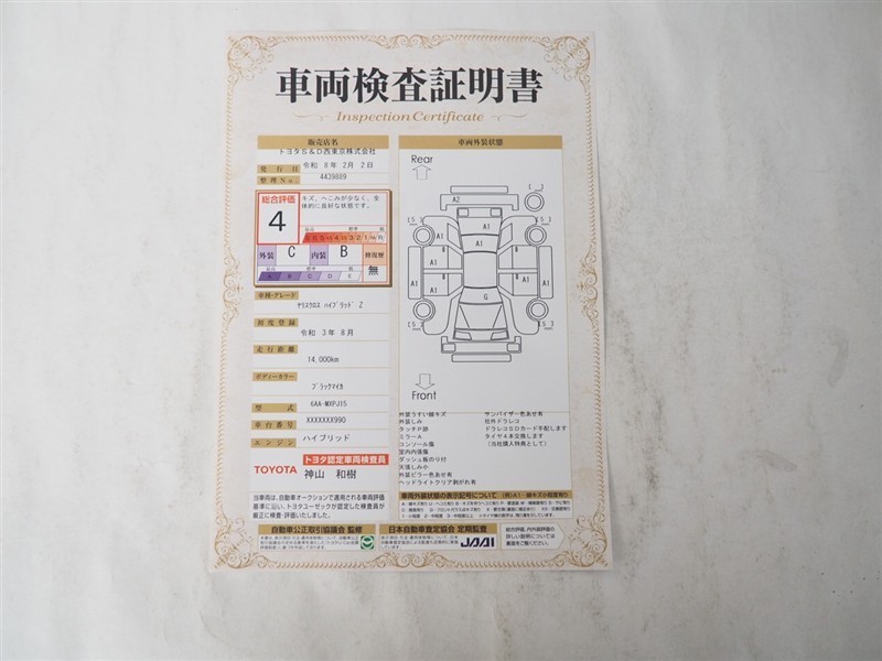 詳細及び現状の車両状態につきましては、店舗スタッフまでお尋ねください。 - 注2)上記と同様の評価点・状態表を「車両検査証明書」として店舗の展示車両に搭載しております。