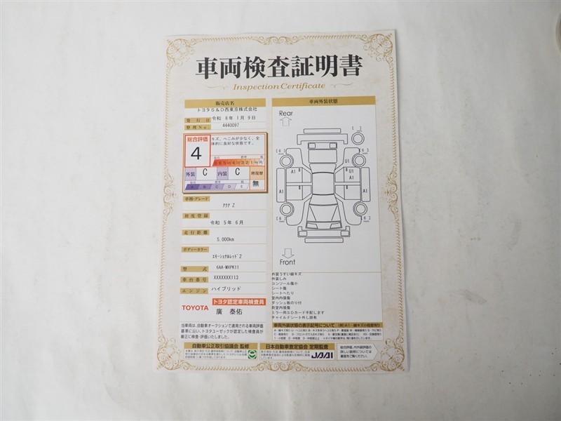 詳細及び現状の車両状態につきましては、店舗スタッフまでお尋ねください。 - 注2)上記と同様の評価点・状態表を「車両検査証明書」として店舗の展示車両に搭載しております。