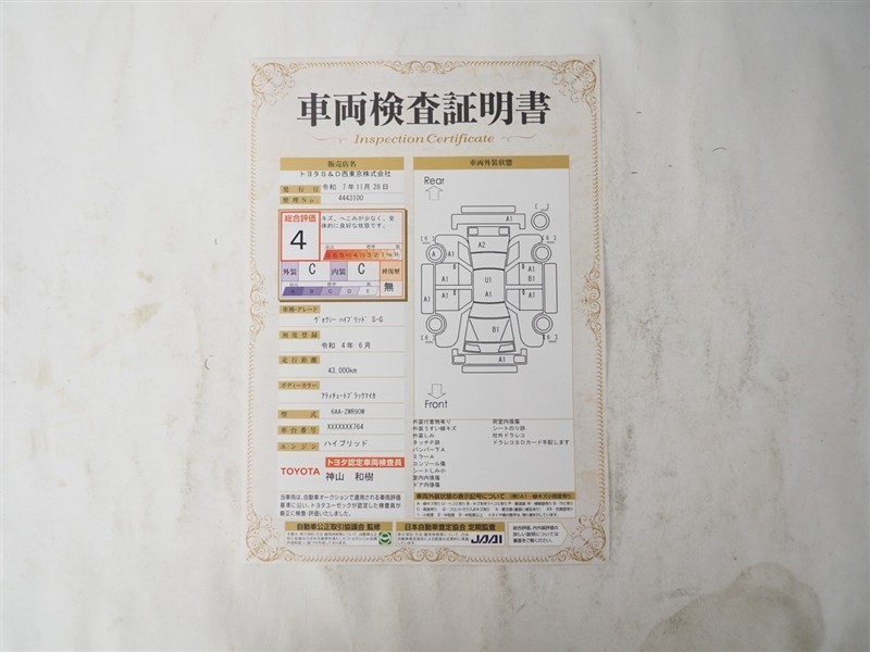 詳細及び現状の車両状態につきましては、店舗スタッフまでお尋ねください。 - 注2)上記と同様の評価点・状態表を「車両検査証明書」として店舗の展示車両に搭載しております。