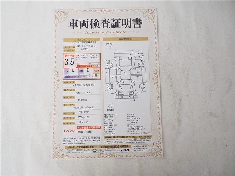詳細及び現状の車両状態につきましては、店舗スタッフまでお尋ねください。 - 注2)上記と同様の評価点・状態表を「車両検査証明書」として店舗の展示車両に搭載しております。