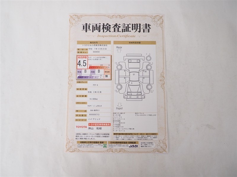 詳細及び現状の車両状態につきましては、店舗スタッフまでお尋ねください。 - 注2)上記と同様の評価点・状態表を「車両検査証明書」として店舗の展示車両に搭載しております。