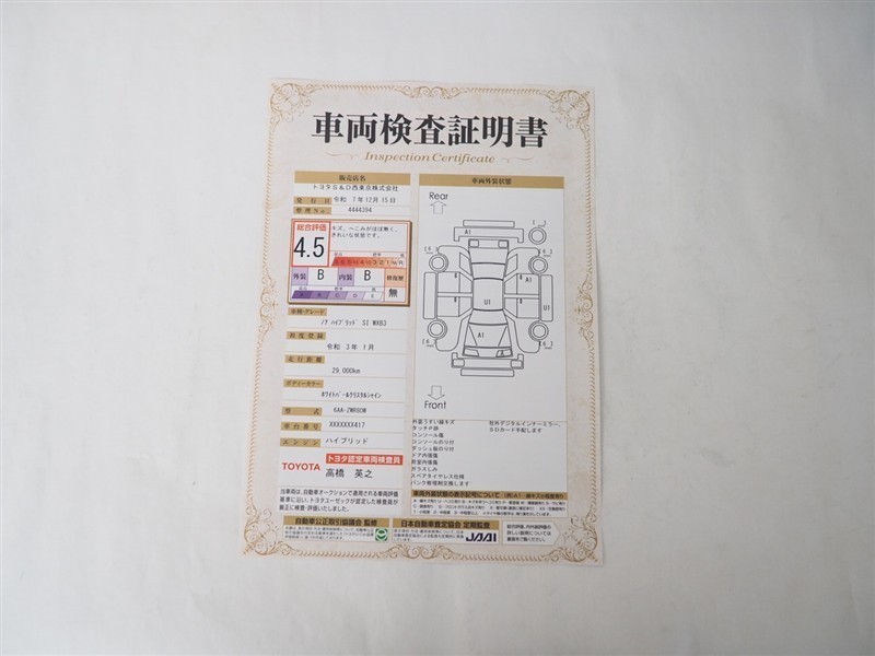 詳細及び現状の車両状態につきましては、店舗スタッフまでお尋ねください。 - 注2)上記と同様の評価点・状態表を「車両検査証明書」として店舗の展示車両に搭載しております。