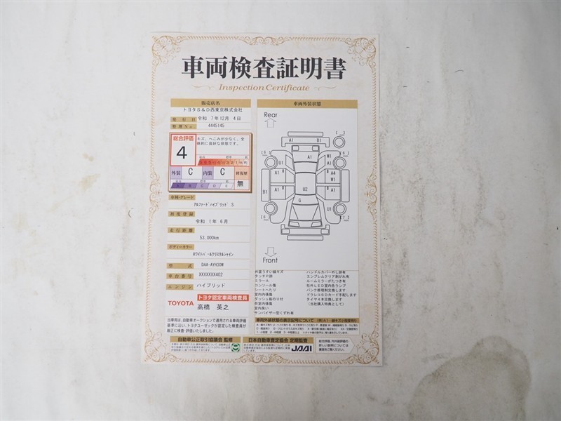 詳細及び現状の車両状態につきましては、店舗スタッフまでお尋ねください。 - 注2)上記と同様の評価点・状態表を「車両検査証明書」として店舗の展示車両に搭載しております。