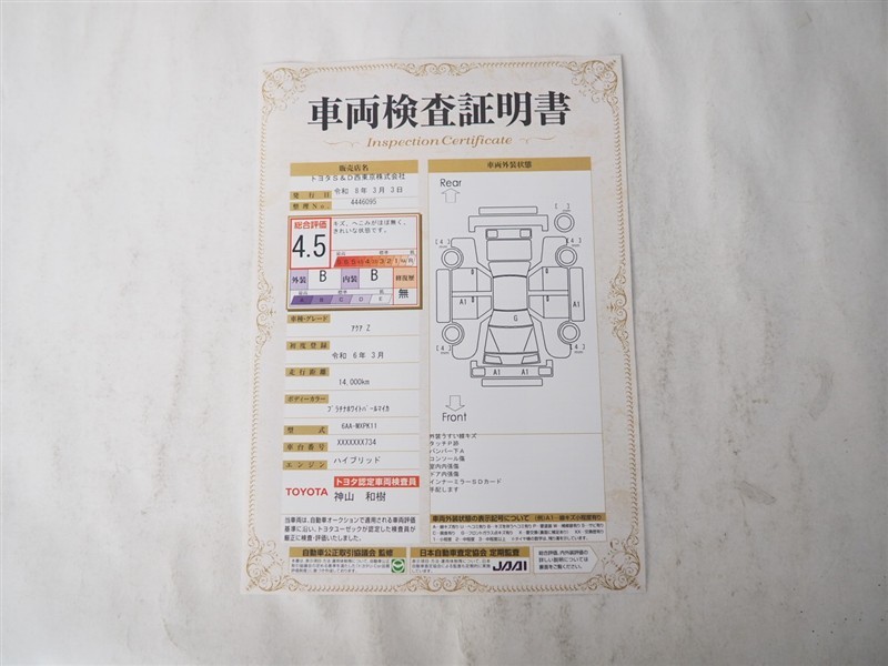 詳細及び現状の車両状態につきましては、店舗スタッフまでお尋ねください。 - 注2)上記と同様の評価点・状態表を「車両検査証明書」として店舗の展示車両に搭載しております。