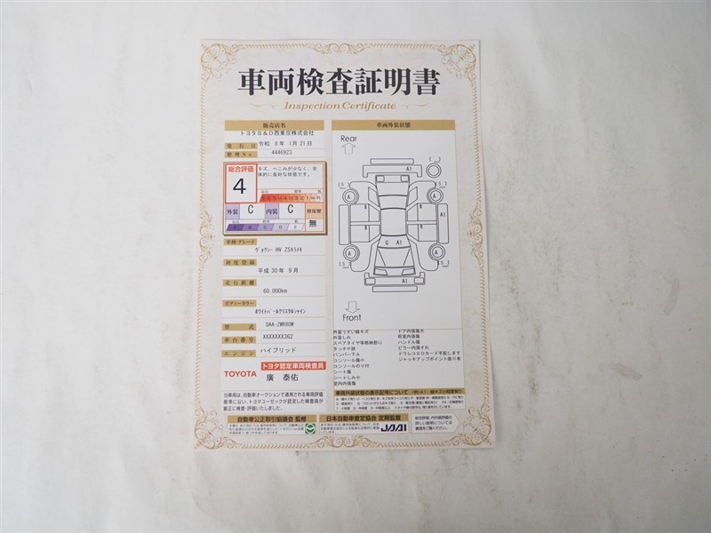 詳細及び現状の車両状態につきましては、店舗スタッフまでお尋ねください。 - 注2)上記と同様の評価点・状態表を「車両検査証明書」として店舗の展示車両に搭載しております。