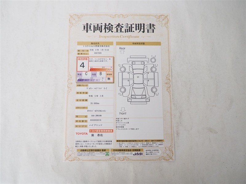 詳細及び現状の車両状態につきましては、店舗スタッフまでお尋ねください。 - 注2)上記と同様の評価点・状態表を「車両検査証明書」として店舗の展示車両に搭載しております。