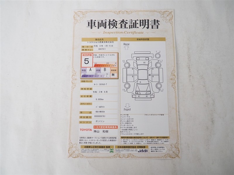詳細及び現状の車両状態につきましては、店舗スタッフまでお尋ねください。 - 注2)上記と同様の評価点・状態表を「車両検査証明書」として店舗の展示車両に搭載しております。