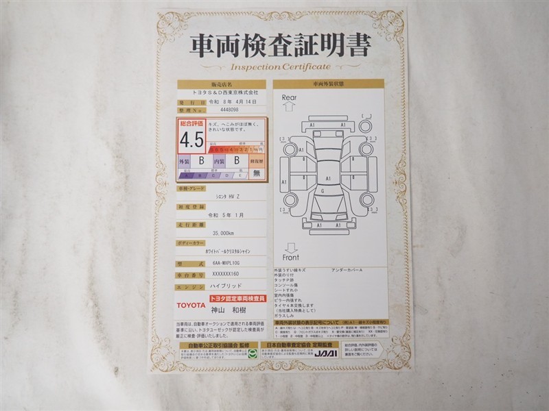 上記と同様の評価点・状態表を「車両検査証明書」として店舗の展示車両に搭載しております。