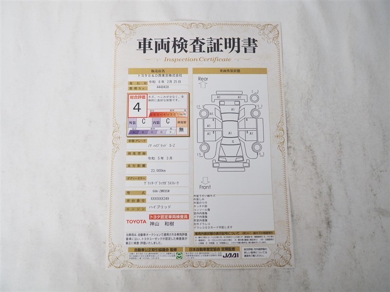 詳細及び現状の車両状態につきましては、店舗スタッフまでお尋ねください。 - 注2)上記と同様の評価点・状態表を「車両検査証明書」として店舗の展示車両に搭載しております。