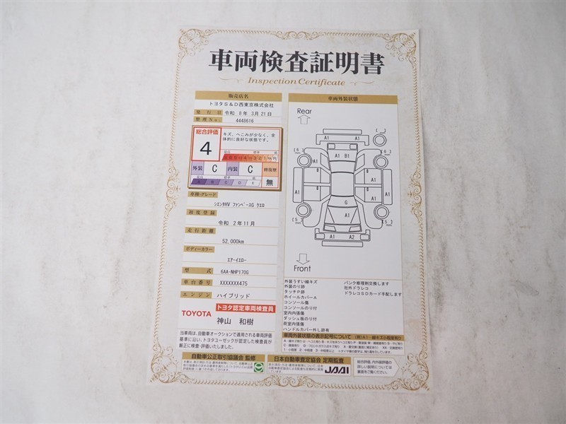 詳細及び現状の車両状態につきましては、店舗スタッフまでお尋ねください。 - 注2)上記と同様の評価点・状態表を「車両検査証明書」として店舗の展示車両に搭載しております。