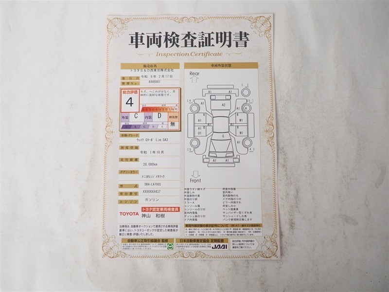 詳細及び現状の車両状態につきましては、店舗スタッフまでお尋ねください。 - 注2)上記と同様の評価点・状態表を「車両検査証明書」として店舗の展示車両に搭載しております。