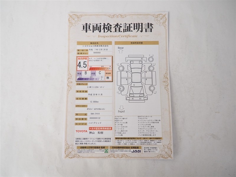 詳細及び現状の車両状態につきましては、店舗スタッフまでお尋ねください。 - 注2)上記と同様の評価点・状態表を「車両検査証明書」として店舗の展示車両に搭載しております。