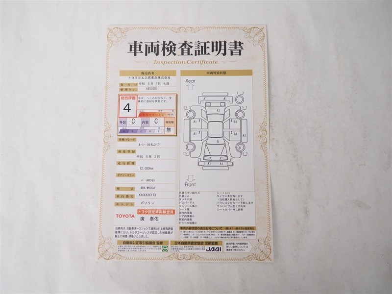 詳細及び現状の車両状態につきましては、店舗スタッフまでお尋ねください。 - 注2)上記と同様の評価点・状態表を「車両検査証明書」として店舗の展示車両に搭載しております。