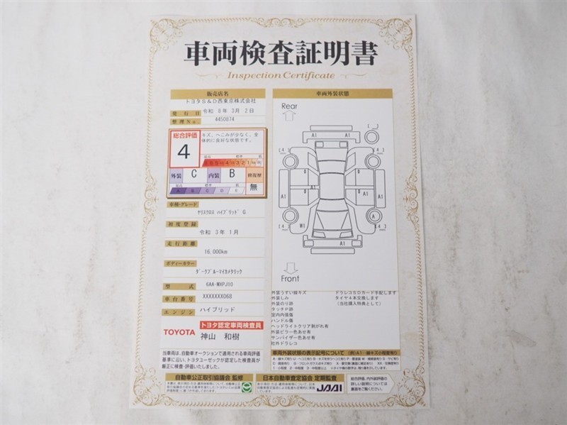 詳細及び現状の車両状態につきましては、店舗スタッフまでお尋ねください。 - 注2)上記と同様の評価点・状態表を「車両検査証明書」として店舗の展示車両に搭載しております。