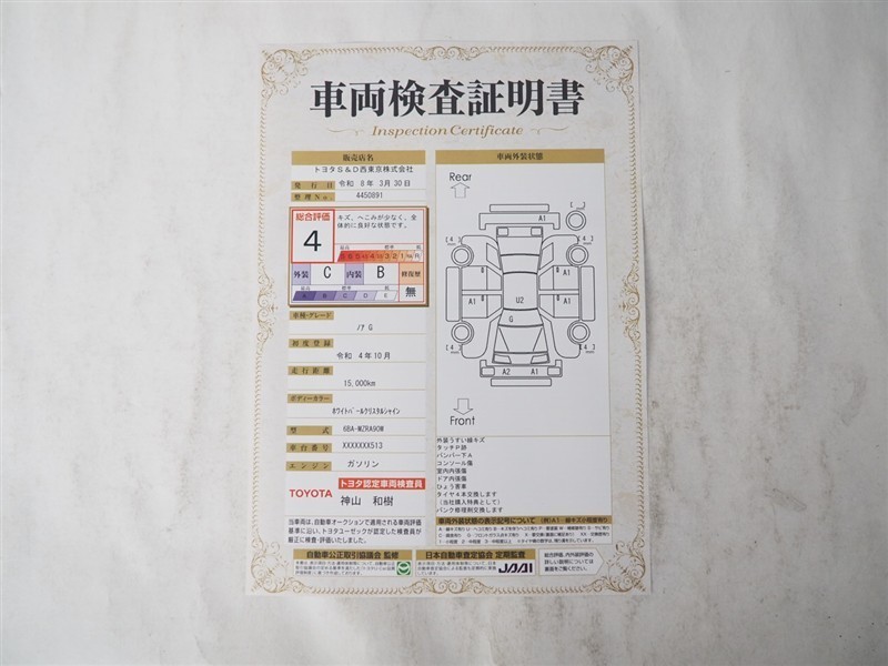 詳細及び現状の車両状態につきましては、店舗スタッフまでお尋ねください。 - 注2)上記と同様の評価点・状態表を「車両検査証明書」として店舗の展示車両に搭載しております。