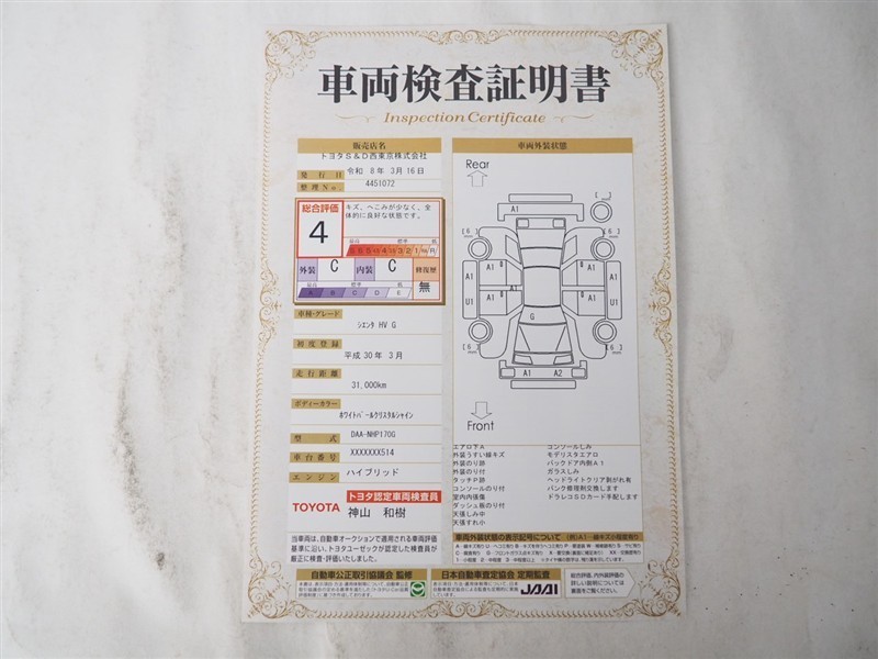 詳細及び現状の車両状態につきましては、店舗スタッフまでお尋ねください。 - 注2)上記と同様の評価点・状態表を「車両検査証明書」として店舗の展示車両に搭載しております。