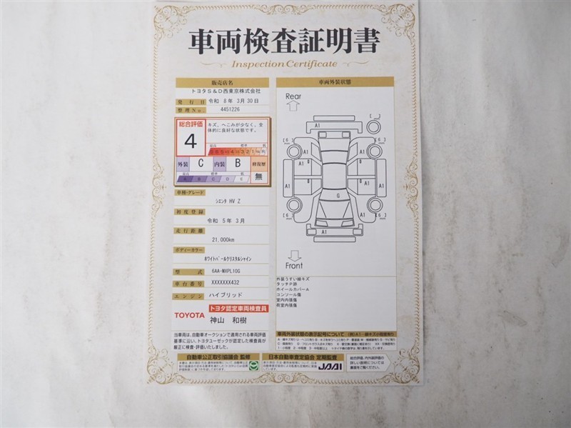 詳細及び現状の車両状態につきましては、店舗スタッフまでお尋ねください。 - 注2)上記と同様の評価点・状態表を「車両検査証明書」として店舗の展示車両に搭載しております。