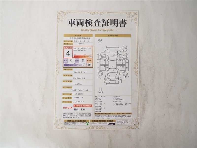 詳細及び現状の車両状態につきましては、店舗スタッフまでお尋ねください。 - 注2)上記と同様の評価点・状態表を「車両検査証明書」として店舗の展示車両に搭載しております。