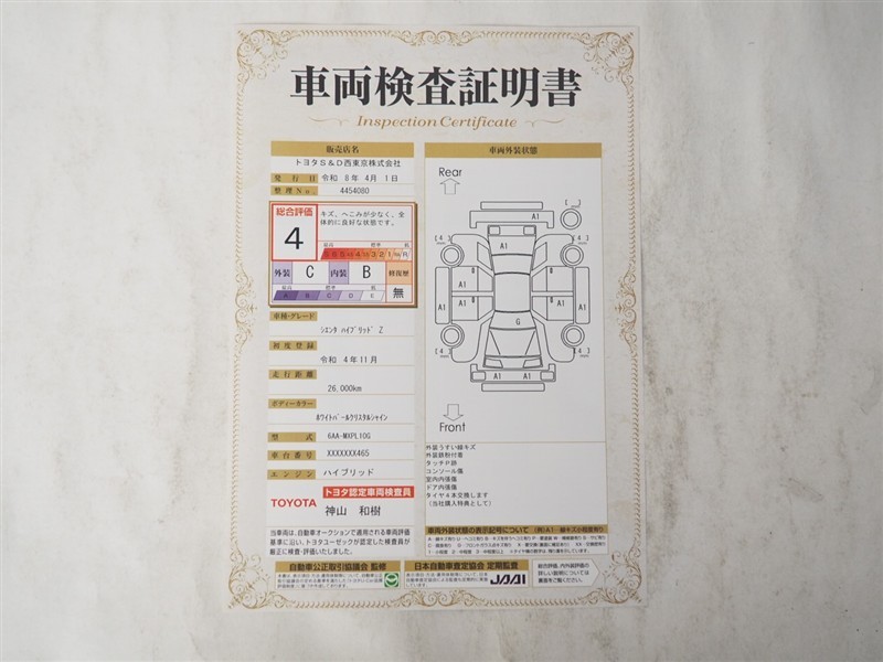 詳細及び現状の車両状態につきましては、店舗スタッフまでお尋ねください。 - 注2)上記と同様の評価点・状態表を「車両検査証明書」として店舗の展示車両に搭載しております。