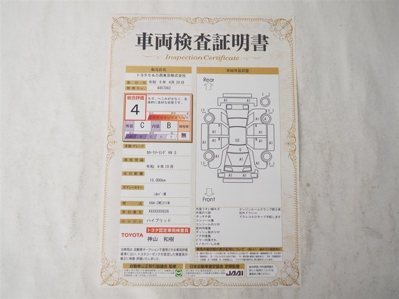 上記と同様の評価点・状態表を「車両検査証明書」として店舗の展示車両に搭載しております。