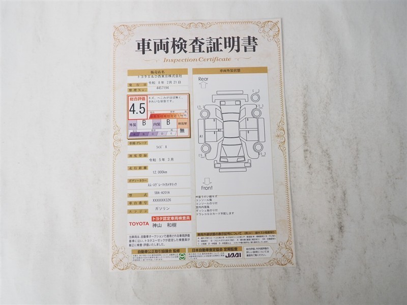詳細及び現状の車両状態につきましては、店舗スタッフまでお尋ねください。 - 注2)上記と同様の評価点・状態表を「車両検査証明書」として店舗の展示車両に搭載しております。