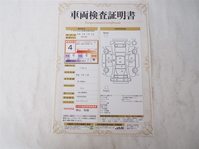 詳細及び現状の車両状態につきましては、店舗スタッフまでお尋ねください。 - 注2)上記と同様の評価点・状態表を「車両検査証明書」として店舗の展示車両に搭載しております。
